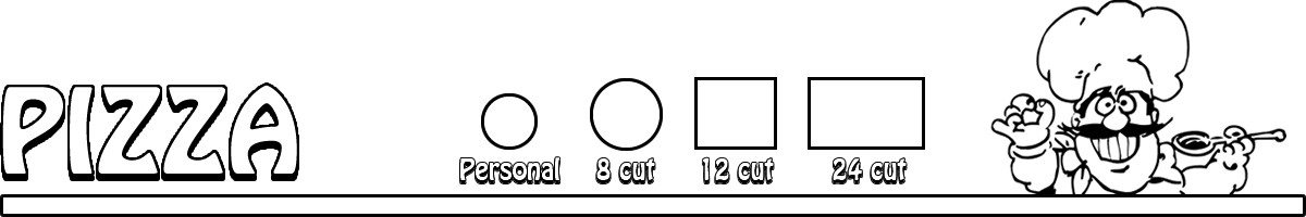 ITEMS: Extra sauce, double cheese, sausage, mushrooms, ham, broccoli, peppers, pepperoni, onions, black olives, meatballs, anchovies, hot peppers, bacon, diced tomatoes, eggplant, ricotta cheese, pineapple, or white (garlic and oil)